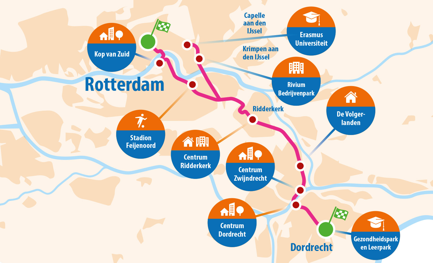 De route verbindt Dordrecht en Rotterdam (zowel het centrum als Kralingse Zoom), via de tussengelegen woonkernen Zwijndrecht, Hendrik-Ido-Ambacht, Ridderkerk en Capelle aan den IJssel. De route loopt langs grootschalige nieuwe woningbouwlocaties als de Volgerlanden en Rivium. Ook de Kuip en de nabijgelegen woningbouwlocatie Feyenoord City liggen langs de route. In totaal wordt er 32 kilometer aan fietspaden verbeterd. De MRDH betaalt maximaal 70 procent van de kosten van de verbetering of aanleg van het deel van de route in de Metropoolregio.